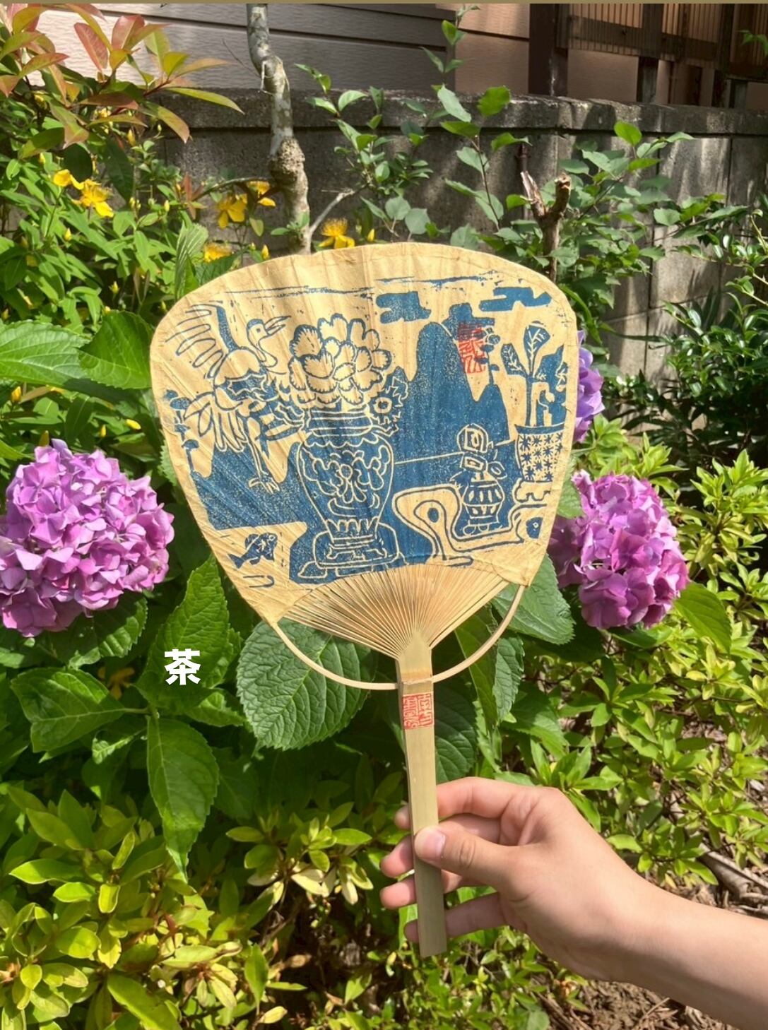中国・蘇州で買い付けた伝統技法で漉かれた紙に木版で絵柄を刷り、竹骨に一枚一枚手貼りした特製の手作り団扇です。