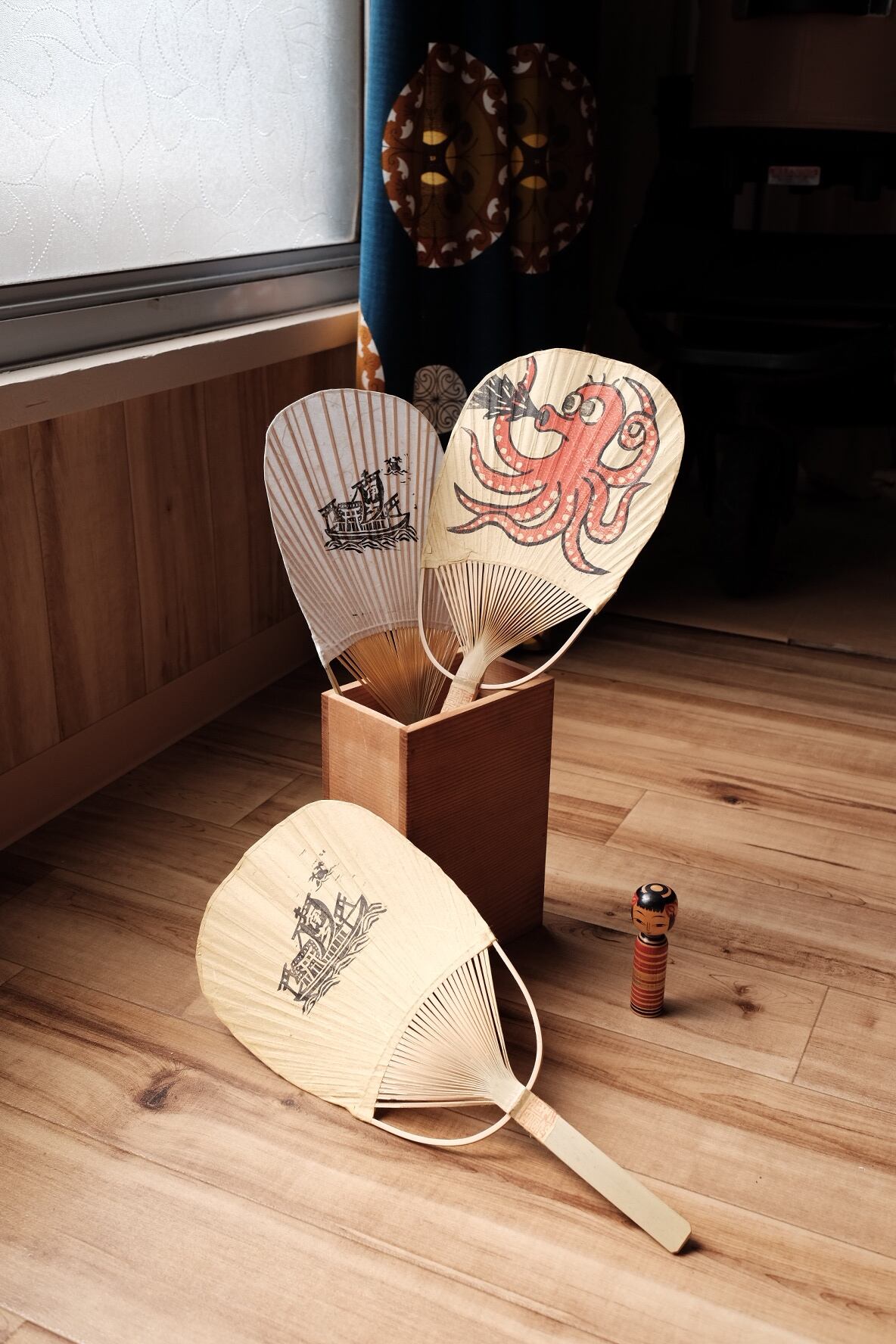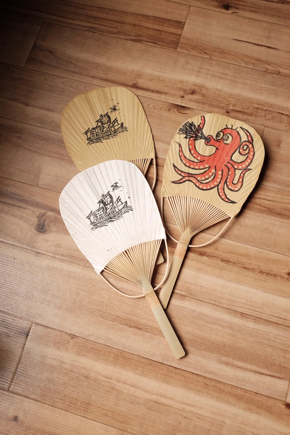 中国・蘇州で買い付けた伝統技法で漉かれた紙に木版で絵柄を刷り、竹骨に一枚一枚手貼りした特製の手作り団扇です。