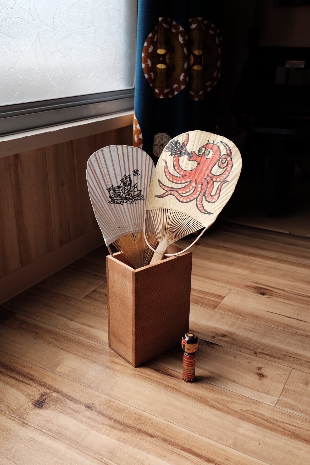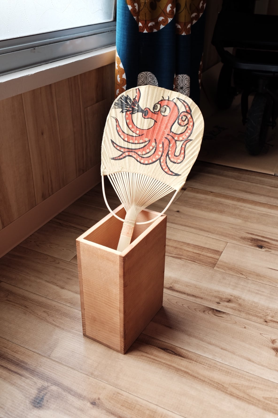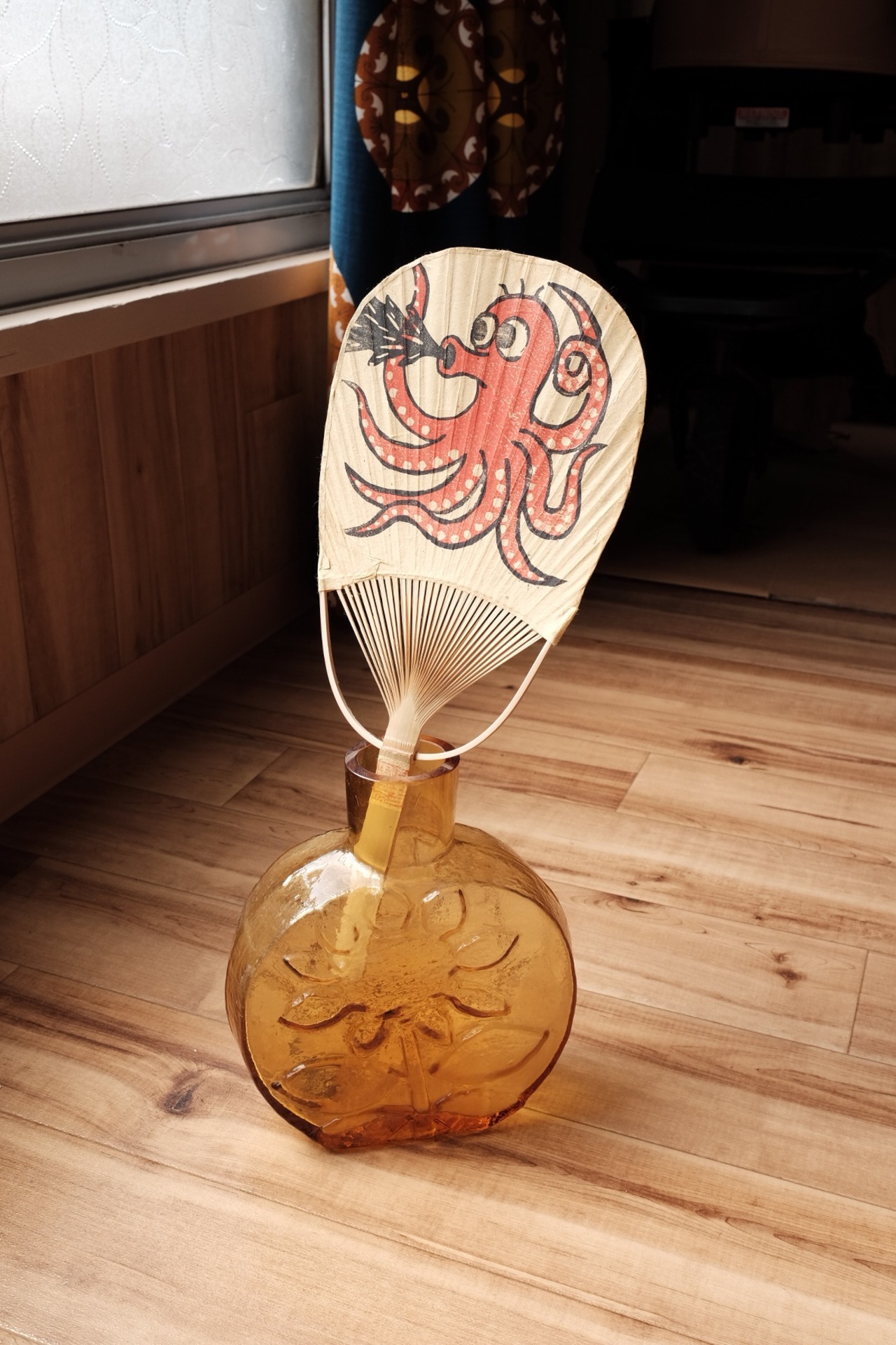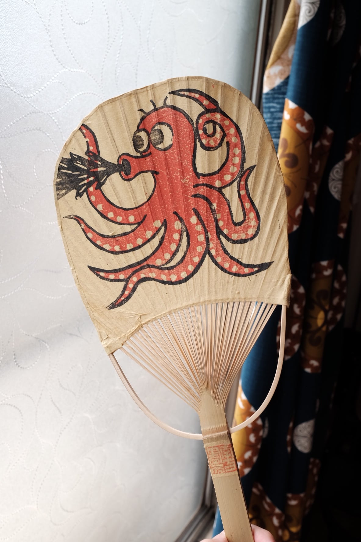 渋めの茶漉き紙に鮮やかな赤いタコが映える小判形の団扇です。お祭りやお出かけのおともにも、お部屋のワンポイントに飾っていただくのにも素敵な一点です。