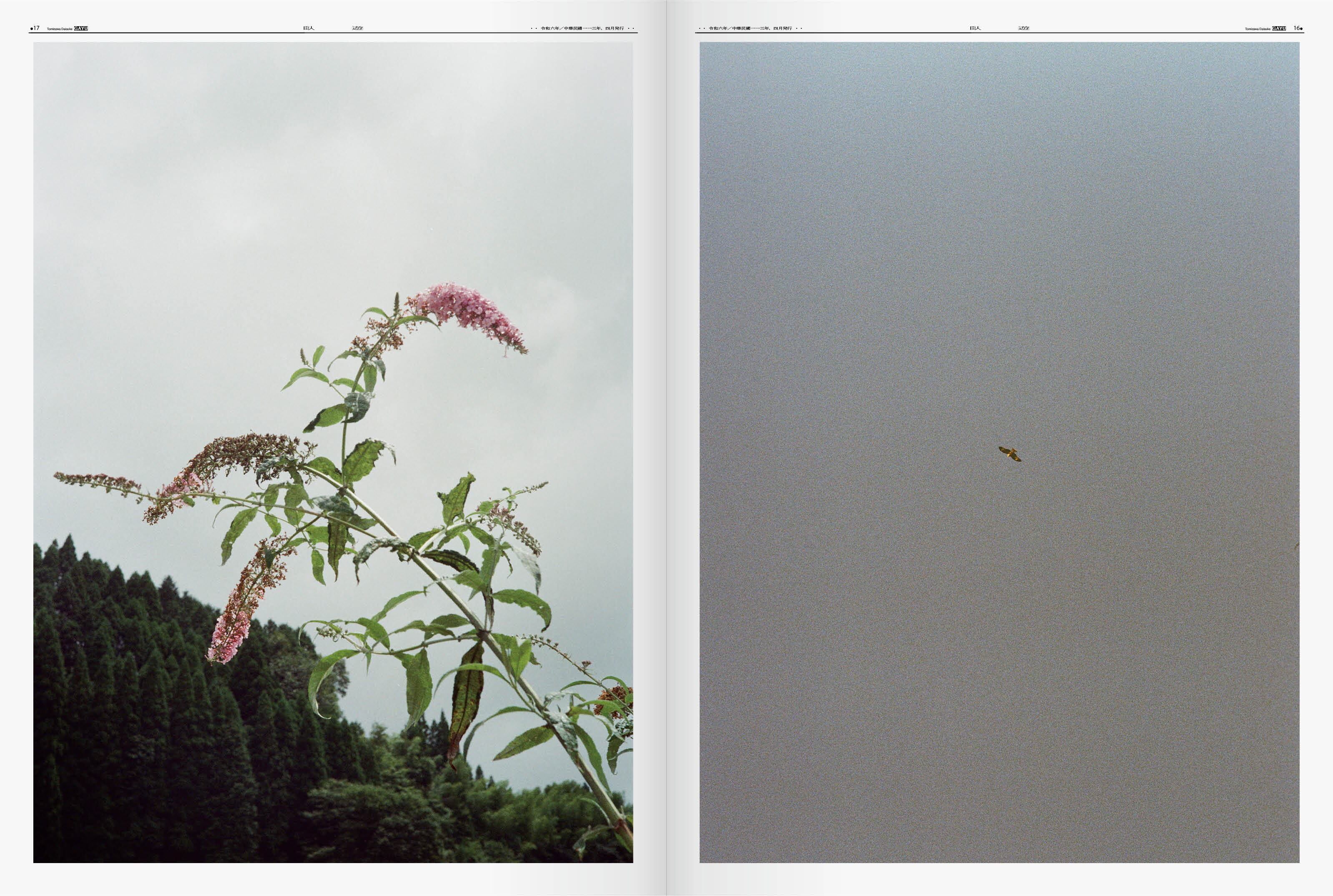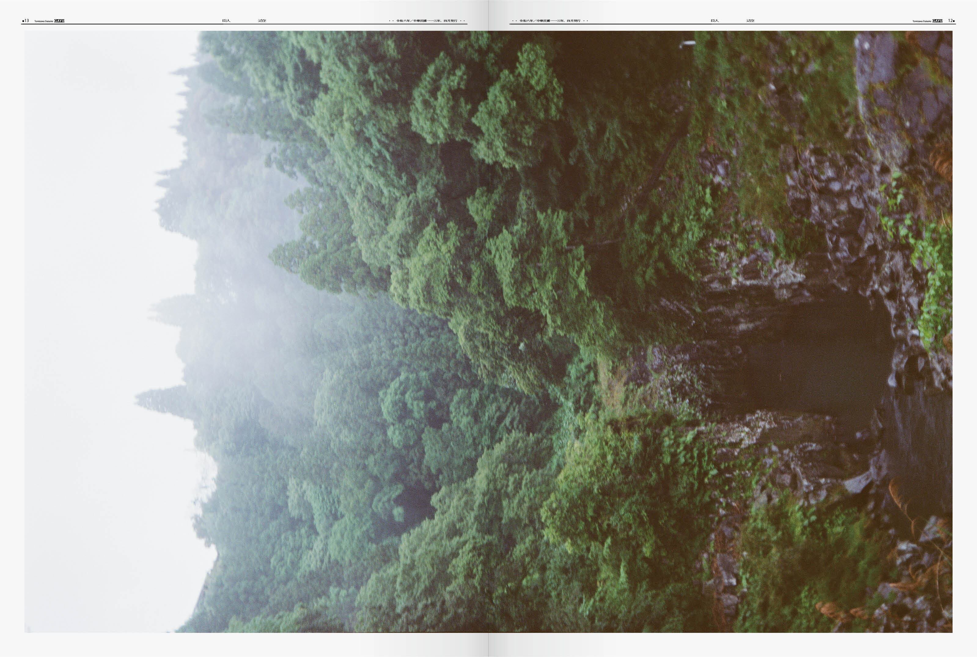 写真家・富澤大輔による本作「臥遊」は、KYOTOGRAPHIE (京都国際写真祭)の「KG+」で発表され、京都の印刷所=京都新聞印刷にて実際の新聞と同じ印刷機で刷られた、新聞型大判写真集です。 “臥して以て之に遊ばん”――これは中国の隠者、宗炳(そうへい、375 年〜443 年)が、山水画の前で臥したまま…つまり寝そべりながら、想像で、山水画に描かれた風景の中を歩き楽しむことを語った言葉です。過去を写す「写真」に対して、山水画は、神や仙人の住む憧れの地、つまり現実を離れた桃源郷 =「時間の外側」の風景を描きます。“臥遊”とは、記憶の一部を写真的な見方に依存している現代の私たちにとって、風景/記憶/過去/時間といった人間の体の「想像する力」の本質に迫る重要なキーワードかもしれません。 『写真が持つ「世界への窓」としての性格を、前近代的なものの見方に思いを馳せながら、「過去のとある瞬間としてではない写真」の在り方を考えた。』と語る、富澤の新たなる出発点となる写真集です。